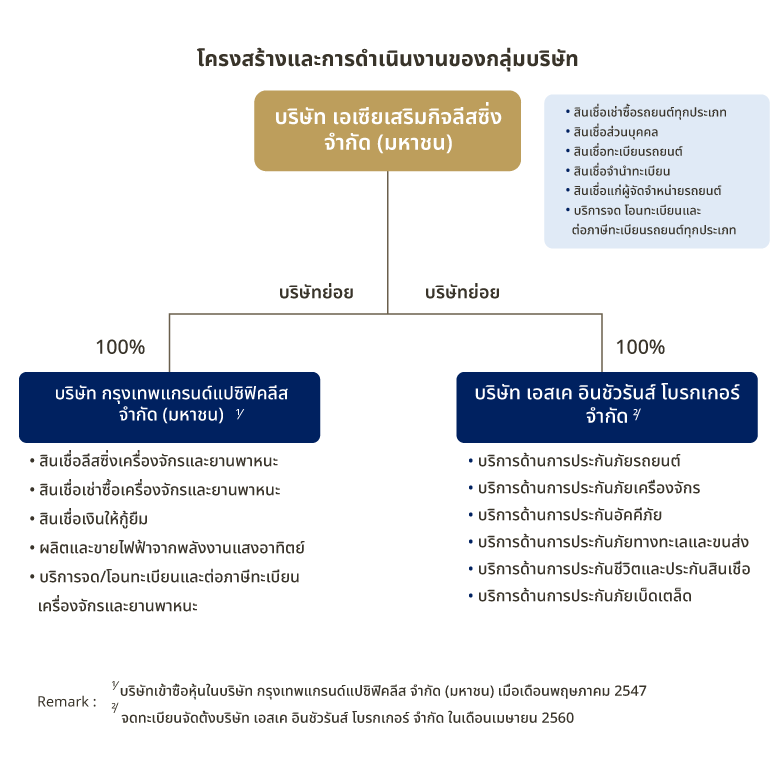 บริษัทมีบริษัทย่อย 2 แห่ง คือ 1) บริษัท กรุงเทพแกรนด์แปซิฟิคลีส จำกัด (มหาชน) (“BGPL”) ประกอบธุรกิจให้สินเชื่อเช่าซื้อและลีสซิ่ง เครื่องจักรและยานพาหนะ สินเชื่อเงินกู้ยืมเพื่อธุรกิจ และสินเชื่อสำหรับระบบพลังงานแสงอาทิตย์ (Solar Rooftop) และ 2) บริษัท เอสเค อินชัวรันส์ โบรกเกอร์ จำกัด (“SKIB”) ประกอบธุรกิจนายหน้าประกันภัย และประกันชีวิต โดยมีโครงสร้างการดำเนินงานของกลุ่มบริษัทดังนี้