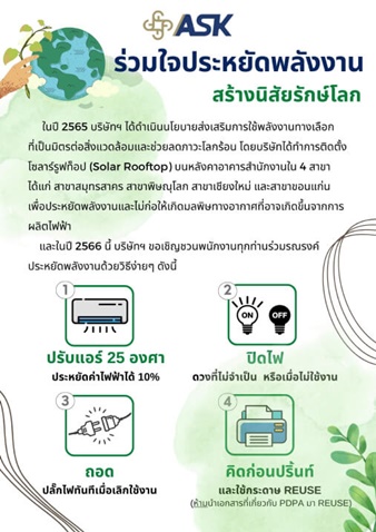 ทั้งนี้ ผู้สนใจสามารถดูรายละเอียดนโยบายที่เกี่ยวข้อง รวมทั้งการเปิดเผยข้อมูลผลการดำเนินงานในมิติสิ่งแวดล้อม แสดงในหัวข้อ “มิติสิ่งแวดล้อม” ของรายงานความยั่งยืนประจำปี 2567 และในเว็บไซต์ของบริษัท (www.ask.co.th) ในส่วนของ “นักลงทุนสัมพันธ์”